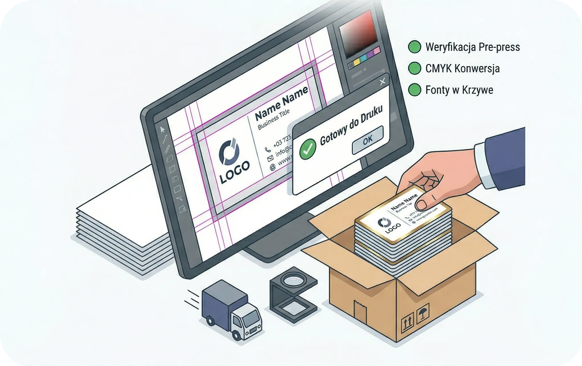 Przygotowujemy plik do druku (proces DTP): ustawiamy spady, marginesy bezpieczeństwa, konwertujemy kolory do przestrzeni CMYK i krzywimy fonty. Po Twojej ostatecznej akceptacji, projekt trafia na maszyny drukarskie, a gotowe wizytówki są starannie pakowane i wysyłane.